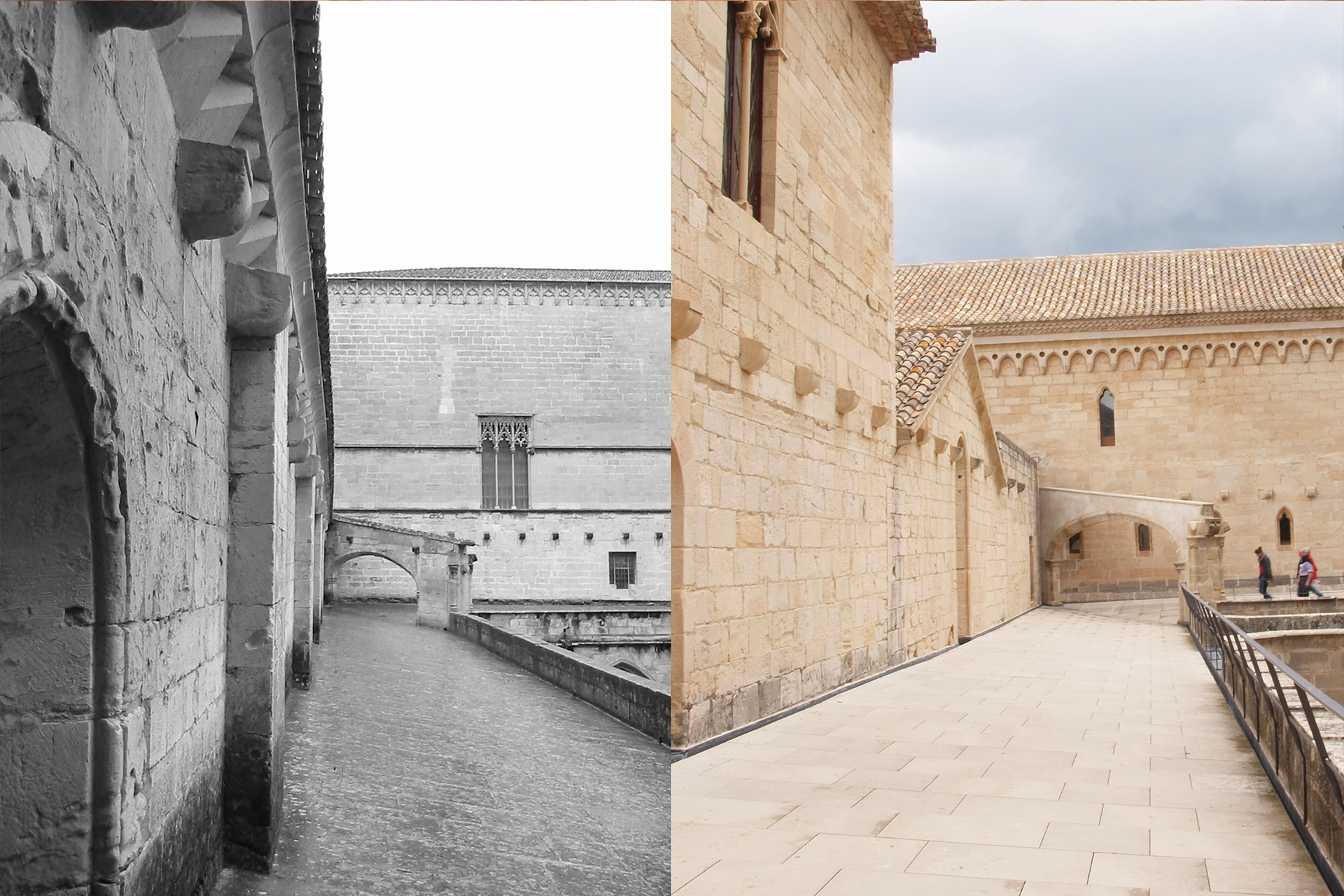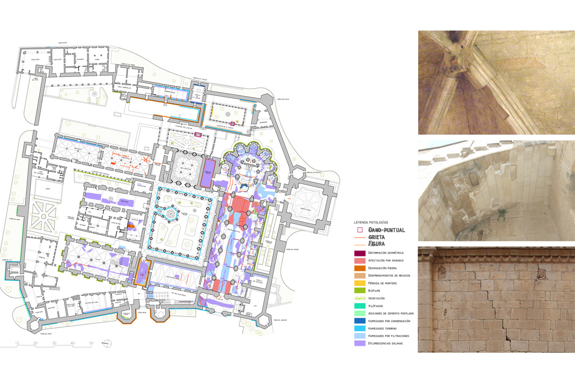 En la primera fase de las obras se trabajó en las cubiertas del claustro y del templete, para proteger e impedir las entradas de agua en las bóvedas y dirigir, canalizar y evacuar las aguas pluviales. Después de un ciclo anual, se comenzó con la segunda fase interviniendo en el patio, las galería inferiores y el templete, para evacuar del patio las aguas pluviales, proteger y consolidar las bóvedas y los paramentos verticales de las galerías, así como acondicionar el jardín.