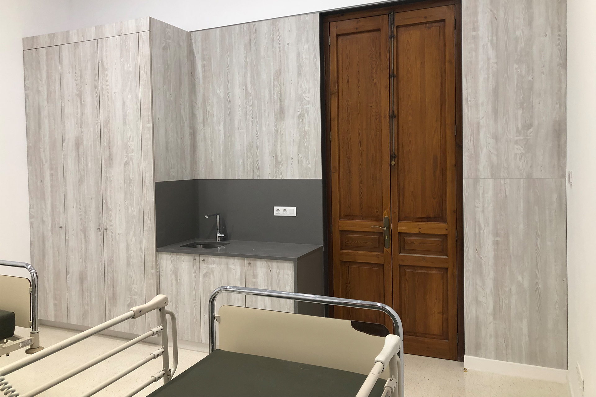 Rehabilitación parcial de la planta baja del ala este del pabellón de la iglesia para ampliar los espacios de la Escuela Universitaria de Enfermería que actualmente ocupa el ala oeste, y reformar la planta primera para un uso de pública concurrencia. Razón por la cual, el edificio se tiene que adecuar para que cohabiten diferentes usos, manteniendo a la vez el actual uso residencial de las viviendas existentes.